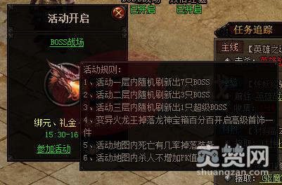 BOSS战场共有3层,每层随机刷新出不同数量的BOSS,由一层到三层,依次刷7只BOSS、3只BOSS、1只BOSS。层数越往后,BOSS难度会越大,掉落的物品会越好。玩家在活动地图内,死亡有几率掉落装备,不过杀人不会增加PK值。