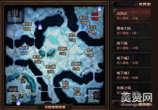 再来谈谈适合中后期的冰风谷:冰风谷的怪物有着自己独特的语言,冰语。走在冰风谷的地面上会有“沙沙”的响声。当角色达到15级后就可以进入冰风谷体验全心的练级感受了。9点钟方位是雪人王区,最为喜欢打雪人王的勇士们喜爱。因为地势非常开阔,对魔法师和弓箭手来说是绝佳的练级场所。最后,在12点方向,杂居着雪人、雪人王和冰风谷的BOSS——冰后。主要怪物:雪虫,寒冰魔,蓝魔怪,暗杀者,雪人,雪人王,冰后。如果你没有到50级,奉劝你最好不要去冒险,可别为了一点经验断送了自己的宝贵性命!