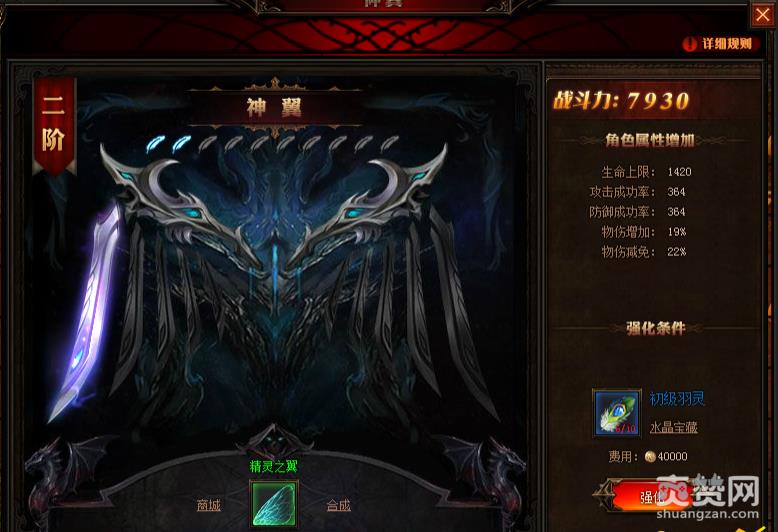 二级翅膀:这个是玩家比较常用以及过度翅膀。需要一个玛雅,一个洛克之羽(天魔以及赤炎魔掉落),一件一代翅膀,还需要N件+4追1以上物件来提高成功率。备注:建议用+7追1幸运物件合成,可有效的出现幸运翅膀的几率。