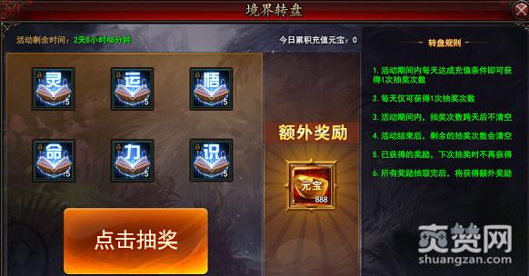 玩家想要抽取境界转盘,就需要每天充值达到一定的数值,玩家抽奖的次数越多,所需要充值的元宝数量也就越多。玩家每天都只可以抽取一次奖励,玩家必定能够在随机在六种不同的境界之书中获得其一,让自己能够激活对应的境界。玩家获取过得境界之书奖励在活动时间内不会再次获得,玩家可以全面的提升自己的境界等阶。当玩家抽取完全部的六种境界之书奖励后,下一次抽奖就会必定获得888元宝的奖励。