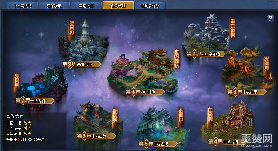西岛战域在开服第三天晚上九点开始,正常活动开启为当天晚上八点开启,全服战斗力前十的家族可获参战资格。活动的匹配规则是家族按战斗力进行排名,举行两两对战。全服10块领地,排名第一和第二的家族争夺第一界和第二界,即血丸神界和黑白世界。三四名的家族争夺第三界和第四界,即火魔界和血魔界。五六名的家族争夺玄冥界和暗冥界。七八名的家族争夺陨月界和鬼冥界。