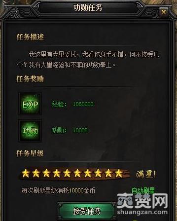 那么蓝月传奇功勋任务怎么刷新呢?其实很简单,玩家们点击自动刷新按钮即可,而每次刷星需要花费10000金币。玩家若是将任务的星级刷到满星,完成任务以后再消耗60万金币领取3倍的任务奖励,那么完成10次功勋任务下来,获得的经验和功勋值可以说是绝对能让其他没有掌握这个技巧的玩家们羡慕不已的了。