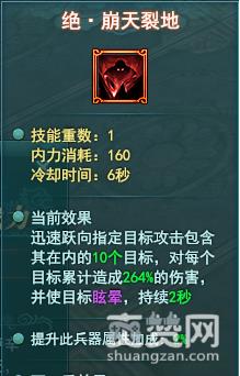 首先,天风霄灵的外形就颇有恶魔城的风范,相信不少男性玩家们会非常喜欢,它自带的绝技绝·崩天裂地自然想必其他神兵,肯定是有着过人之处,技能效果为:迅速跃向指定目标攻击包含其在内的10个目标,对每个目标累计造成264%的伤害,并使目标眩晕,持续2秒。这一技能可以说是拥有着集切入控制输出于一体的强大功能,更加凸显了天风霄灵的神器价值。