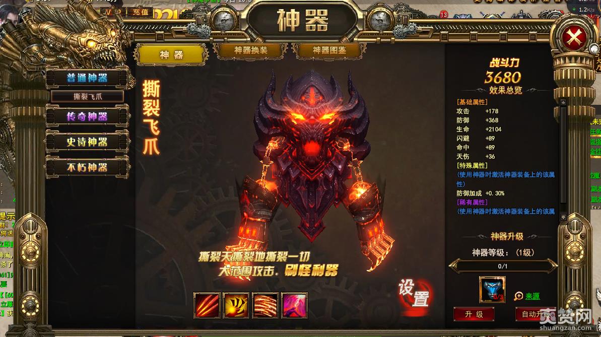 目前游戏中的神器共分为四类,分别是普通神器、传奇神器、史诗神器、不朽神器,获得的难度也是逐层递增的。撕裂飞爪作为最容易获得普通神器,主要的效果为大范围的攻击,被定义为刷怪神器;意大利炮属于传奇神器中的一种,它的特点是攻击自带吸血,对于boss有强力克制的效果,只能够通过运营活动获得;流星锤是pk的神器,能够让目标减速,造成穿透伤害的同时还能够增加自身的防御力,暂时还无法获得;史诗神器女妖战机外形科技感十足,通过运营活动获得,能够带来持续伤害与定身效果;自走火炮外形很像坦克,他能够造成大氛围的真实伤害,并进行生命恢复,目前也无法获得。最后,我们的终极神器,高能战甲,能够造成大范围的高额伤害,增加自身攻击力,与吸收伤害,简直就是bug般的存在。
