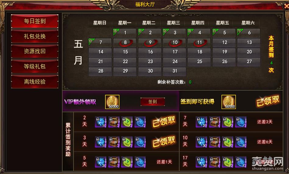 目前福利大厅中玩家们可以领取的福利共有五类,分别是每日签到、礼包兑换、资源找回、等级礼包、离线经验。
