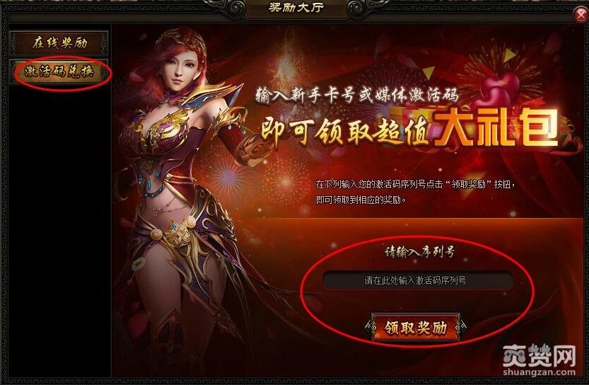 获得礼包码后,玩家们可以找到游戏界面上方的奖励大厅,再在大厅的左侧选择【激活码兑换】,就能进入礼包兑换页面。在“请输入序列号”的下方,将刚刚复制的激活码,粘贴到框中,点击“领取奖励”按钮,即可领取到相应的奖励。
