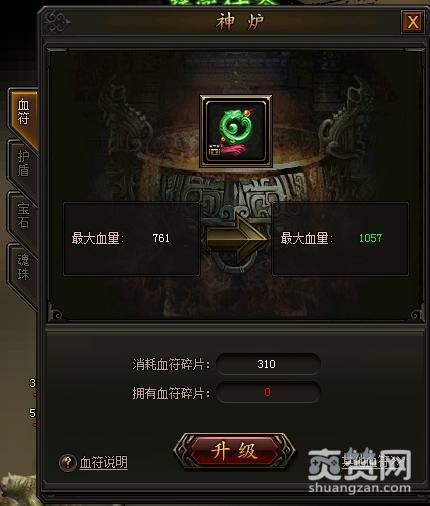 点开熔炉面板,这是提升实力的一大途径,血符可以提升我们的血量上限、宝石对应的是我们的攻击力,魂珠对应的是暴击力与暴击率,护盾则是应对的我们的防御力,在游戏中参与活动可以获取大量的随便,升级激活这些,可以使我们变得更强。