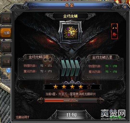 游戏中,龙鳞是龙装系统中的一个分支。龙鳞可以极大地增加角色的防御力,等级越高的龙麟带来的属性加成越多。目前游戏中共有7个阶级的龙鳞,分别是白玉龙鳞、青芒龙鳞、碧霞龙鳞、紫霄龙鳞、仙露龙鳞、鎏金龙鳞、金丝龙鳞。都说升级更给力,那么龙鳞该怎么升级,升级需要消耗什么材料呢?玩家可以通过消耗龙麟碎片来提升龙鳞等级,以获得更高属性。等级越高,所需的龙鳞碎片也就越多,玩家可以通过挑战材料副本来获得更多的龙鳞碎片,不过小编要提醒一句,龙鳞是不可以进行强化的。