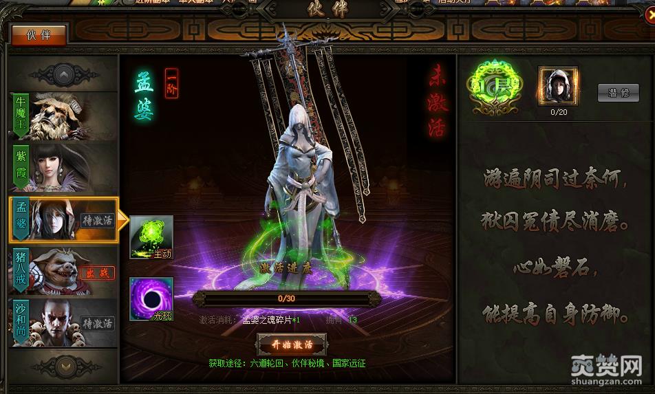 游戏中,玩家们可以通过六道轮回、伙伴秘境、国家远征之中中获得一定数量的孟婆碎片奖励,积累到20枚碎片时,即可成功激活伙伴孟婆。玩家可以直观在自己的伙伴界面中看到激活的进度,每使用一块碎片激活都会为其增长一点的激活进度。此外,玩家们获得的多余的孟婆碎片还可以用来对孟婆进行潜修,潜修能够提升孟婆的基础属性值。