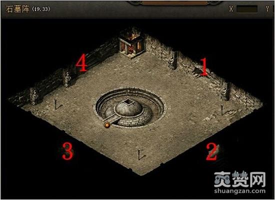 那么屠龙战记魔化白野猪在哪?玩家需要先进入石墓阵。通过热砂荒漠安全区内的NPC探索地图即可进入屠龙战记石墓阵。传送到石墓阵后,玩家需要在四个传送口中找到正确的出口,才能顺利找到魔化白野猪。找到魔化白野猪的走法是1-3-1-3-1-3,如下图所标记: