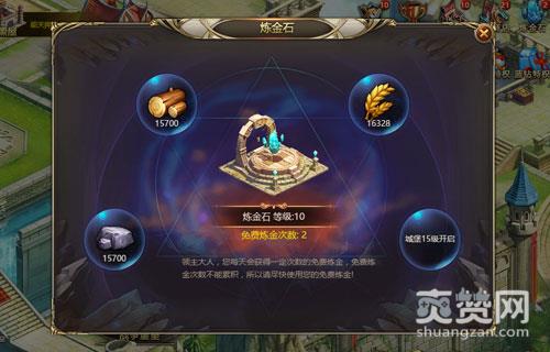 当城堡达到9级时,就可以解锁新的建筑——炼金石,通过使用炼金功能,可以获得各种资源(粮食、木材、铁矿、魔力等),通过升级炼金石可以提升单次炼金获取的资源上限,在资源允许的条件下,建议尽快升级到与城堡等级持平。