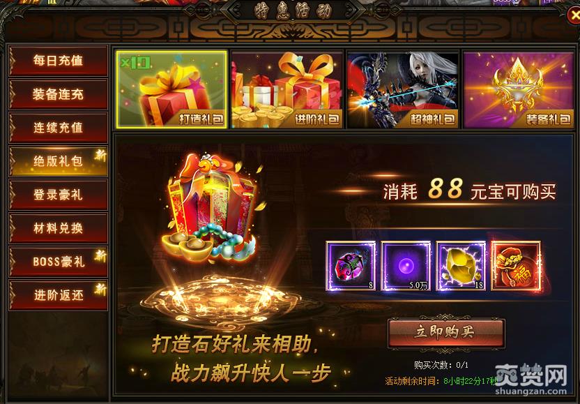 打造礼包:玩家们消耗88元宝即可购买获得,其中包含装备打造石(紫)*8,5W真气,强化石*18,元宝福袋。