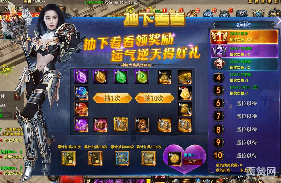 活动右侧显示为本区的礼物排行,玩家们可以直观的看到自己目前的抽奖次数与本区排行。在爽赞小编看来,这一活动还是相当给力的哦,其中不少的稀有道具在获得后更是能够让你的战力极速飙升,各位土豪玩家们不要犹豫啦,赶快到游戏中买买买吧!