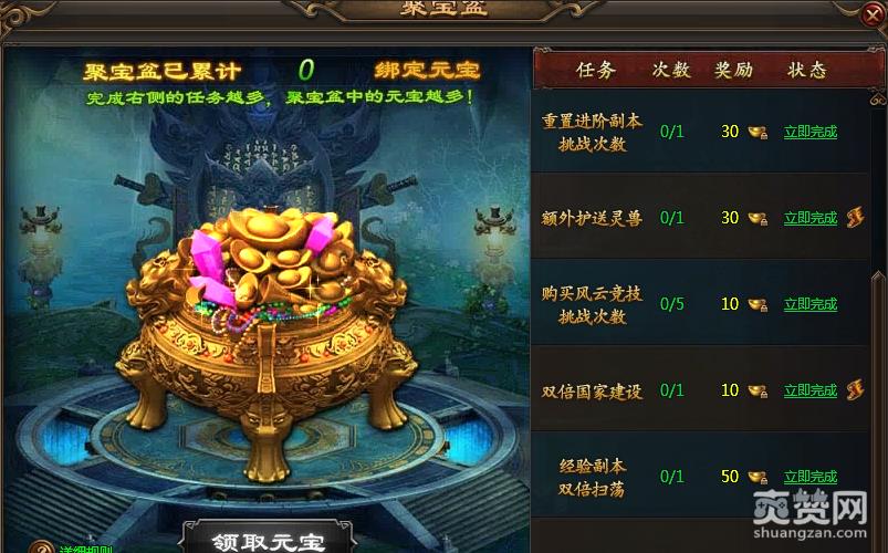 聚宝盆类似于活跃度奖励玩法,玩家们通过完成界面右边的各项任务,即可领取任务旁边的绑元奖励。完成的任务越多,聚宝盆中的奖励也就积累的越多,除了领取任务旁的奖励,还会有额外的一份元宝奖励累计到聚宝盆里,积累到一定的数量,达成聚宝盆下方的条件,即可领取聚宝盆累计的奖励,并且聚宝盆的领取次数是不限的,玩家们只要多次达成聚宝盆下方的条件,就可以多次领取聚宝盆的累计奖励!