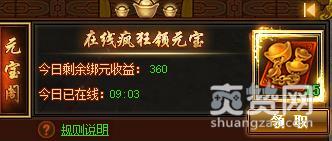 元宝阁的活动界面位于主界面的最左侧,这是一个通过积累在线时间领取元宝的玩法,玩家们在线时长越高,能够相对应获得的绑元收益也就越高。绑元奖励每5分钟结算一次,玩家们可以随时点击“领取按钮”领取目前已经积累的奖励。每日收益时间最高为2小时,超过这一时长就不会有额外的收益了。