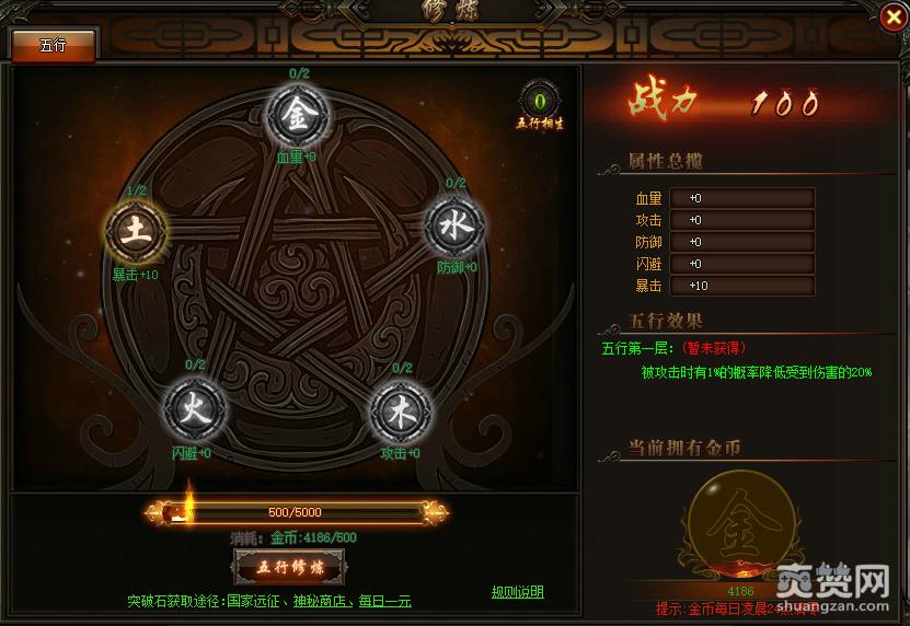 玩家们进行五行修炼需要消耗一定的金币,玩家们可以通过击杀怪物来获得。当金币数量满足五行修炼时,每消耗一次金币,五行境界就会增加一点,达到上限即可突破,提高境界上限继续修炼。突破所需的突破石玩家们可从国家远征、神秘商店、每日一元中轻松获得。