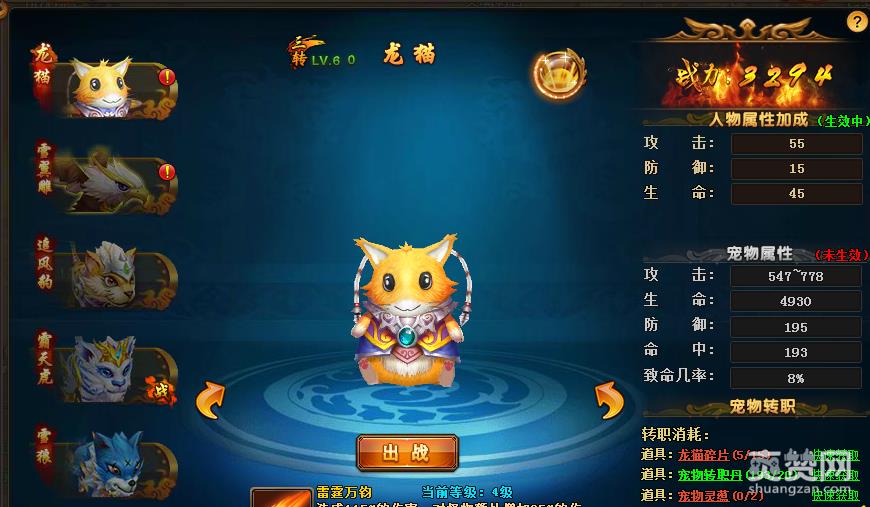 龙猫是初期游戏免费赠送给玩家的宠物,对于人物的属性加成并不算多,主动技能“雷霆万钧”是个单体技能,虽然效果并不是那么好,但等级升高了之后还可以。