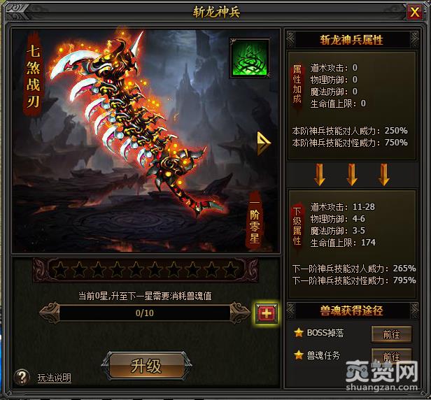 那么神兵要如何升星呢?这就需要用到兽魂值这一道具了,玩家们通过击杀boss获得boss头颅,使用即可兑换一定量的兽魂值,积累了足够的兽魂值就能够提升斩龙神兵等级,激活属性加成,斩龙神兵达到10星,可使用斩龙秘籍升阶,升阶斩龙神兵可以大幅度提升神兵的技能的威力,纵横沙场无所畏惧!