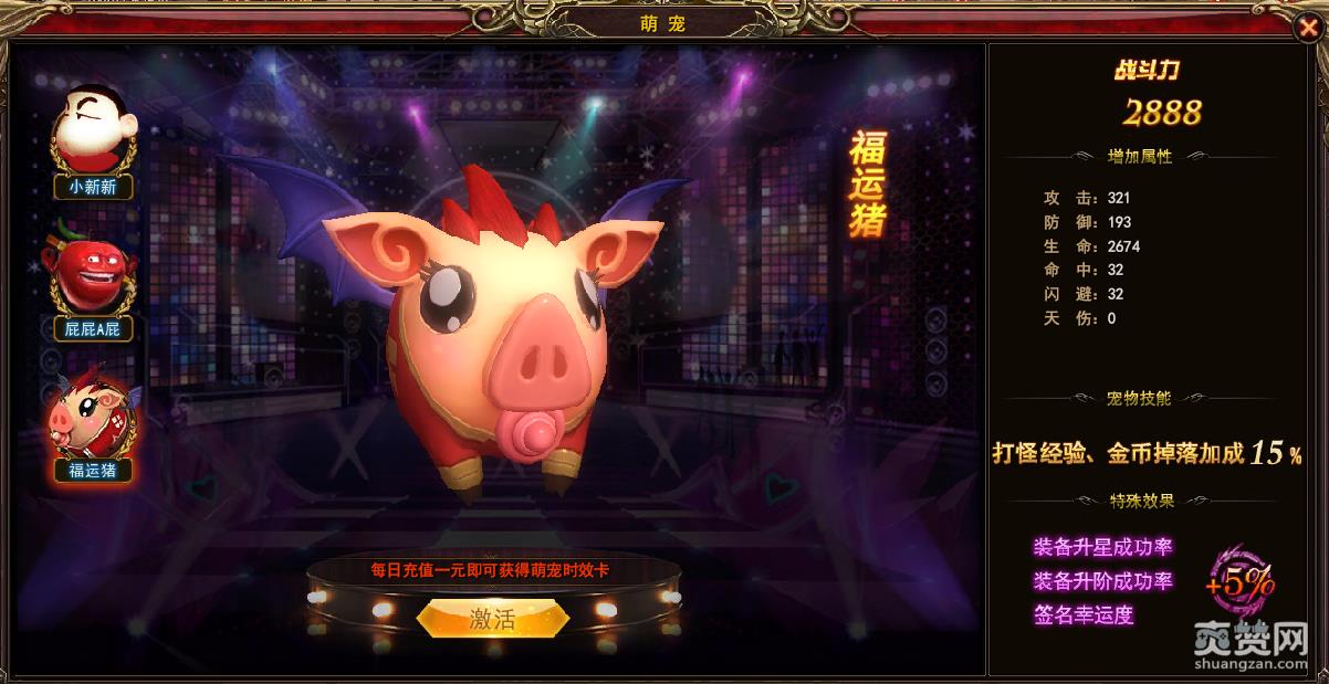 游戏中,福运猪的宠物技能为打怪经验与金币掉落加成15%,这项技能可以说是将之前的两只宠物“小新新”和“屁屁A屁”的技能做了综合,双重实力更为强力。除此外,福运猪更具有特殊的效果加成,装备升星成功率,装备升阶成功率、签名幸运度都能够额外加成5%,这对于热衷装备打造的小伙伴们绝对是一大福音!