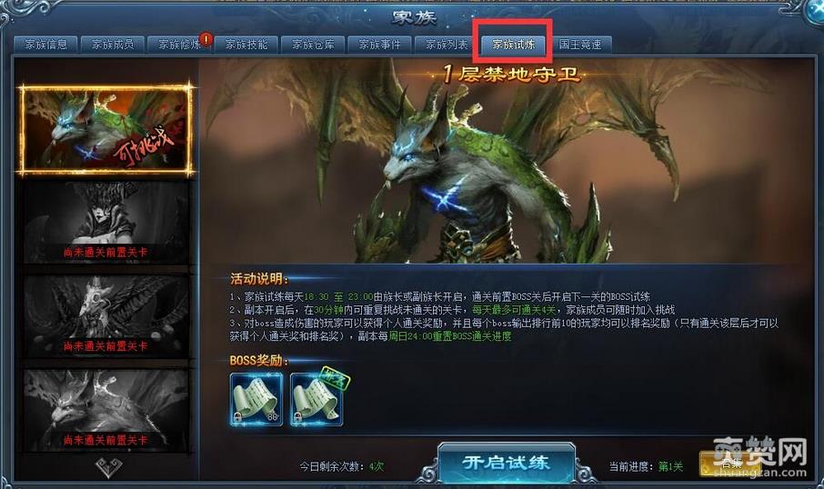 家族试炼玩法是随着家族系统默认开启的,玩家们可从主界面的家族-家族试练进入活动界面,家族试练每天18:30-23:00由族长/副族长开启,通关前置boss关后开启下一关的家族试练。每层关卡有10分钟挑战时间,活动期间内可重复挑战没有通关的boss,家族成员可随时参加家族试练。当boss死亡时,对boss造成一定伤害的玩家可获得个人通关奖励,活动每周日24点重置boss通关进度。