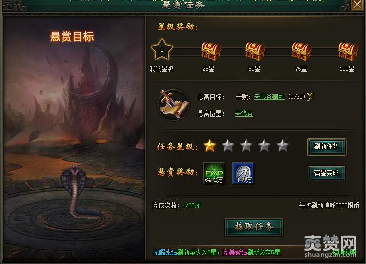 点击“刷新任务”可花费5000银币,刷新悬赏目标以及任务星级,任务星级每次五星为满星,星级越大,获得的悬赏奖励就越丰厚。如果嫌刷新太麻烦,也可点击悬赏奖励厚的“满星完成”,消耗5元宝直接刷新至满星。成为无瑕冰钻每次刷新至少3星;成为完美紫钻每次刷新必定5星!
