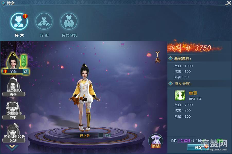 你在思美人中碰到的第一个侍女是丫头,侍女天赋是童真,需要消耗丫头铭牌升级。