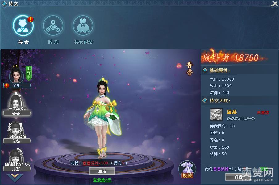 登陆第8天之后,会解锁第二个侍女香香,侍女天赋是温柔,需要消耗香香铭牌升级。