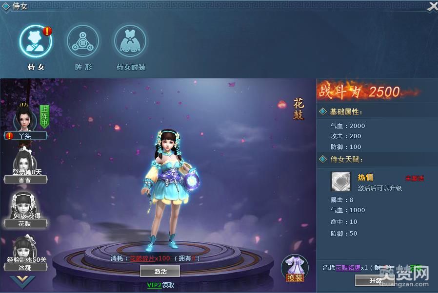 当VIP等级升为VIP2后,会解锁花鼓,侍女天赋是热情,需要消耗花鼓铭牌进行升级。