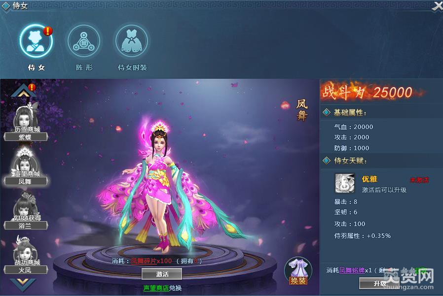 在声望商城中可以兑换凤舞,侍女天赋是优雅,需要消耗凤舞铭牌升级。