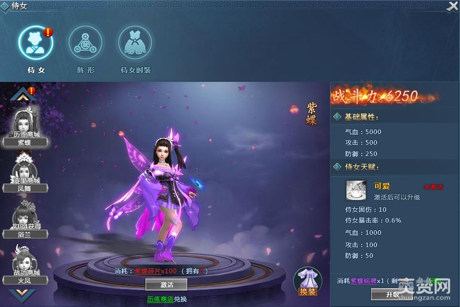 另外,你可以在历练商城兑换紫蝶,侍女天赋是可爱,需要消耗紫蝶铭牌升级。
