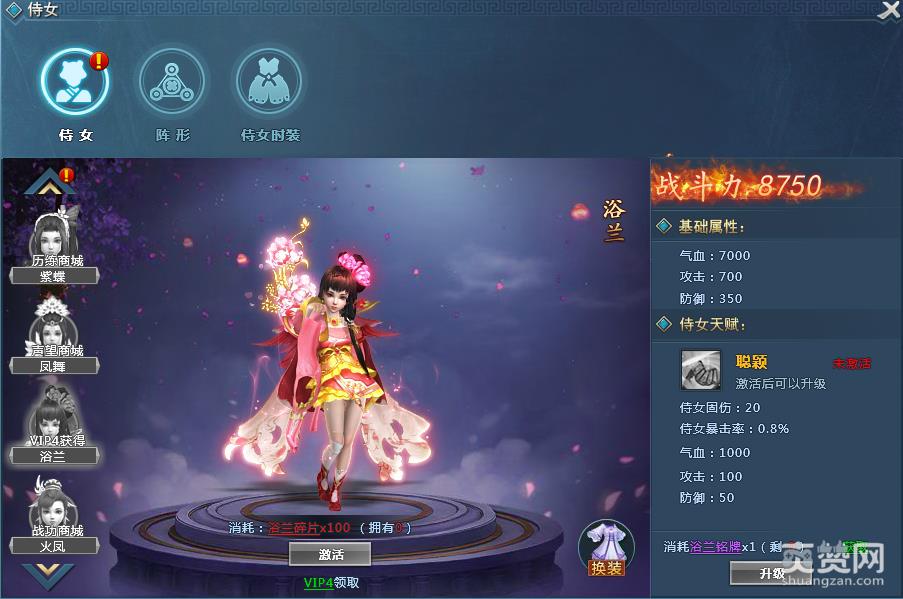 当VIP等级升为VIP4后,会解锁浴兰,侍女天赋是聪颖,需要消耗浴兰铭牌升级。