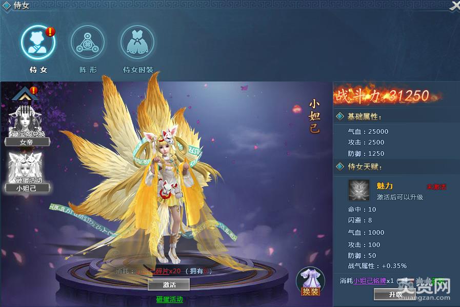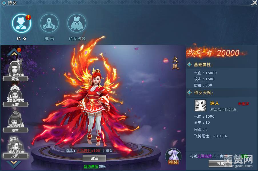 在战功商城可以兑换火凤,侍女天赋是迷人,需要消耗火凤铭牌进行升级。