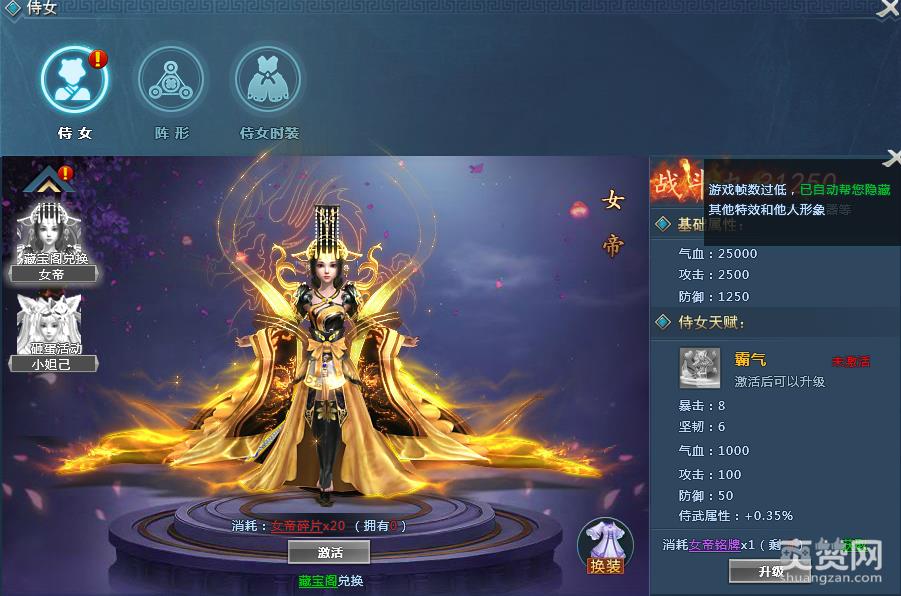 在藏宝阁可以兑换女帝,侍女天赋是霸气,需要消耗女帝铭牌升级。