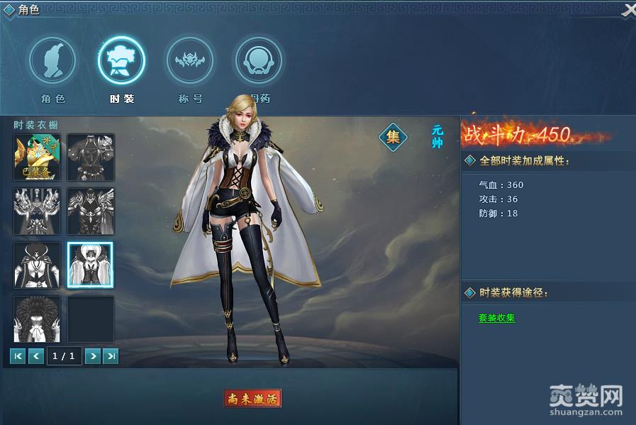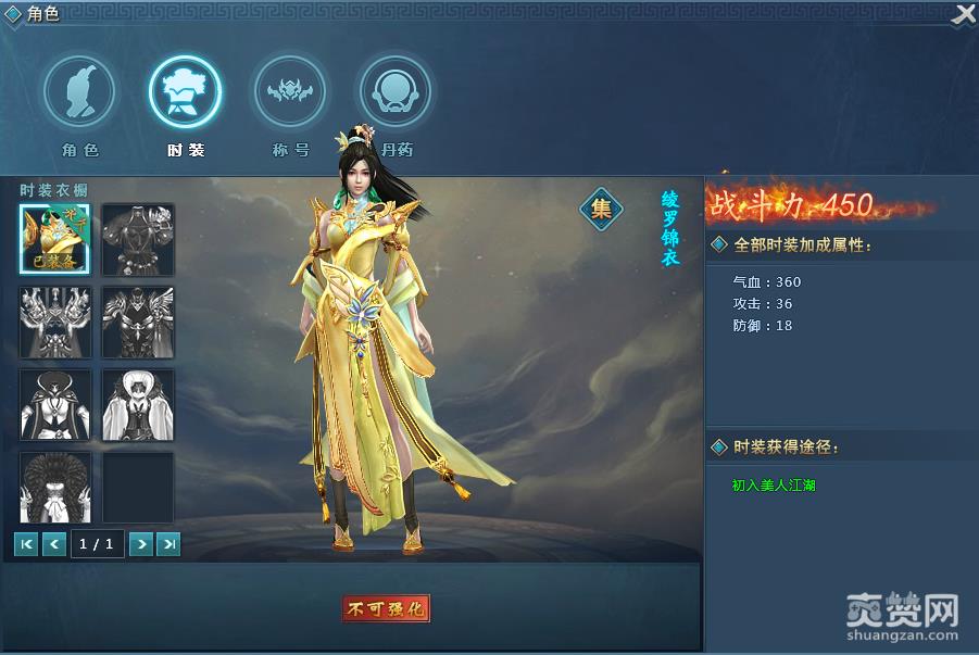 在游戏界面下方中部可以找到角色按钮,点击角色按钮就可以看到时装选项。当你初次进入游戏时,就会获得第一套时装“绫罗锦衣”,这是一套永久时装,不会过期。