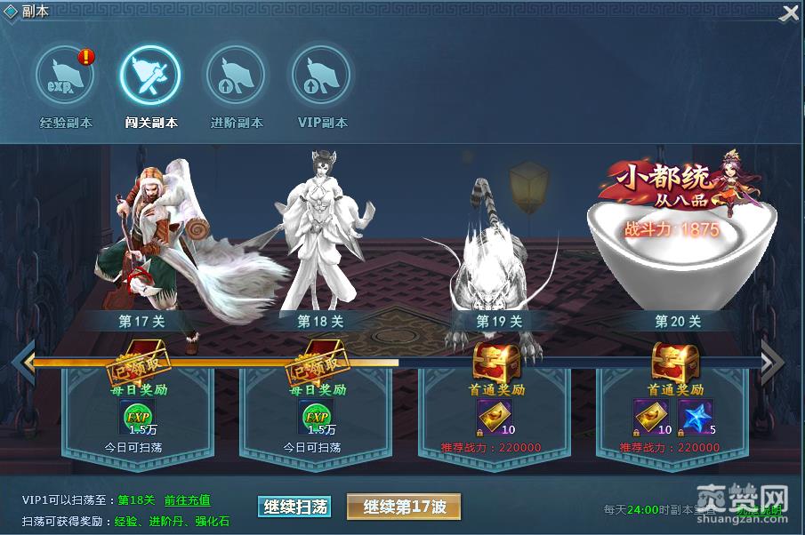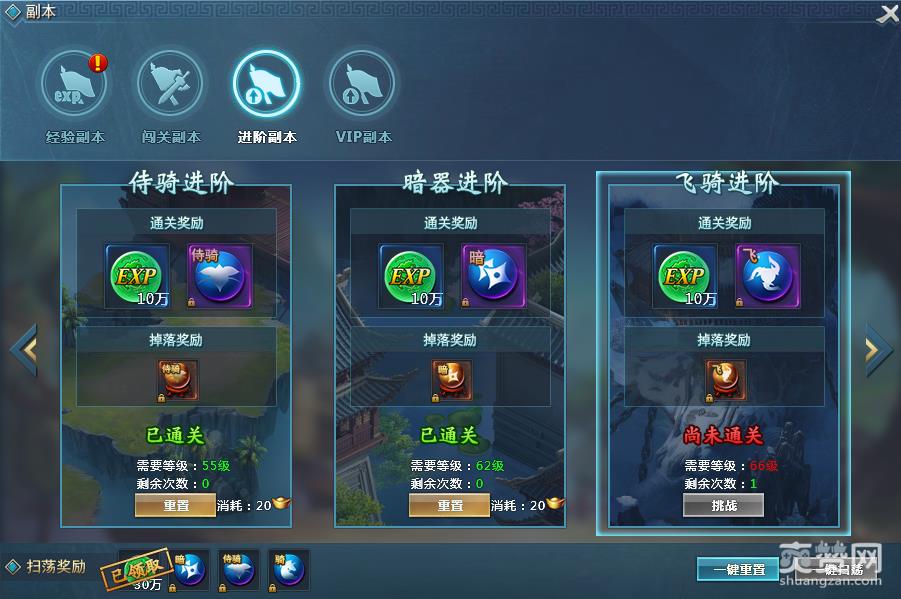 闯关副本在每天的24时会自动重置,并且可以在第二天扫荡已经打通的副本,获得通关奖励。