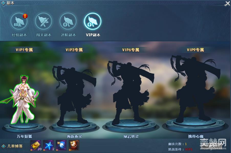 完成VIP副本有几率掉落绑定元宝卡、星级强化石、坐骑技能书、坐骑成长丹等物品。