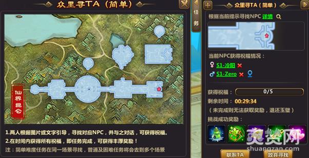 两人需要连续5次根据提示寻找NPC,取得他们的祝福。蓝色难度在同地图、紫色难度在不同地图、程序难度只有文字提示。挑战的关键在于分工合作,先找到了告诉Ta哦。