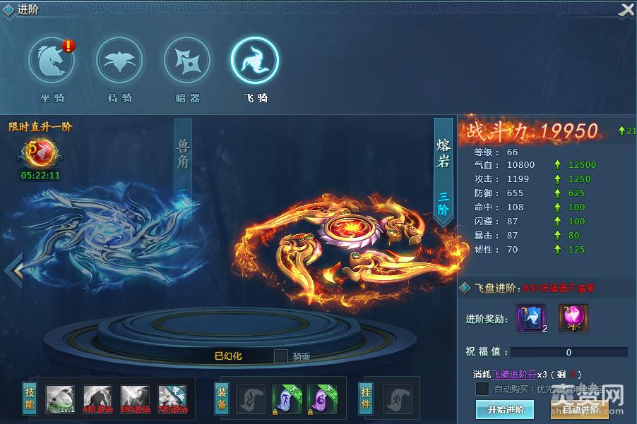 游戏界面下方中部有一个“进阶”按钮,点击进入就可以看到“飞骑”选项。