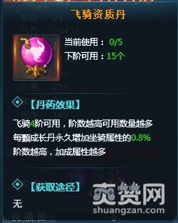 当思美人飞骑达到4阶后,将可以喂食资质丹,资质丹可以百分比增加飞骑的进阶属性;飞骑的阶数越高,可喂食的资质丹颗数越多,同样每颗资质丹增加的属性越多。