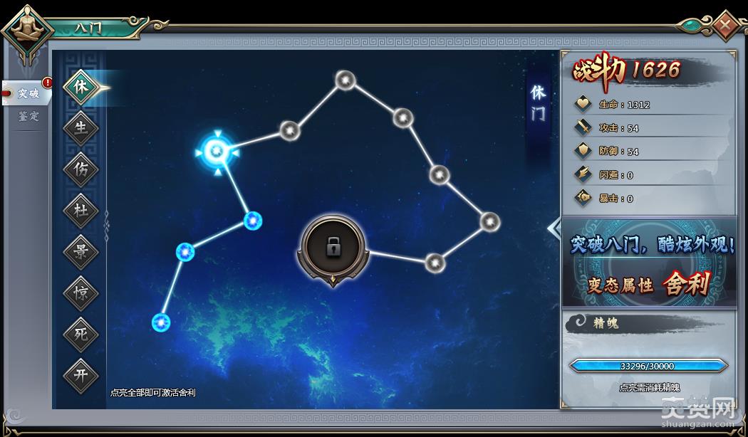 八门分别为休门、生门、伤门、杜门、景门、惊门、死门、开门,每一门均有10个脉门,全部突破后可激活本门舍利镶嵌槽,八门需按顺序突破。