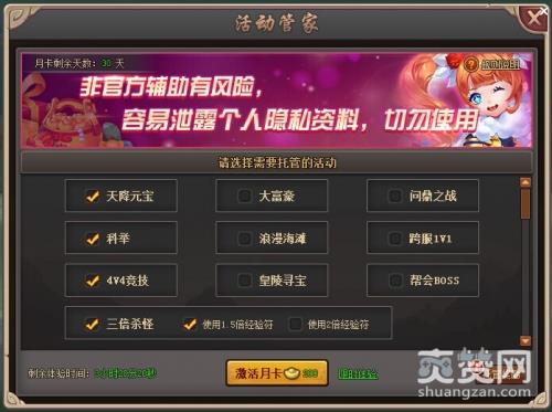游戏中,玩家等级达到50级,VIP等级达到V5即可开启活动管家,玩家花费158元宝购买活动管家月卡,可激活30天的活动管家功能。