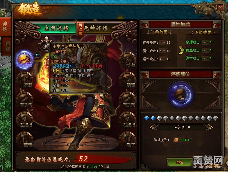 在游戏界面中玩家通过点击锻造按钮即可进入装备淬炼界面。游戏中的淬炼一共分为蓝钻淬炼、紫钻淬炼、黄钻淬炼三个档次,每个档次分别有12级淬炼等级。最初的蓝钻淬炼仅消耗金币即可完成淬炼,淬炼有失败的概率,淬炼失败会增加幸运值,幸运值慢则下次淬炼100%成功。所以要把主角元神的装备都淬炼到12级,也是需要花费巨额的金币。
