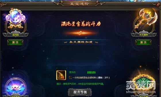 至宝到达一定等级后,可使用天地灵宝道具进行进阶,进阶后可获得百分比属性加成。
