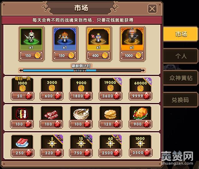 如果市场中刷新出了您想要的战魂的话,千万要在他被刷新掉之前购买哦。俗话说先下手为强嘛!而用血钻则可以购买金币、加成类道具以及神格。虽然购买相应数量的神格会赠送魂匣的钥匙,但是并不能像金币一样购买指定战魂的哦!