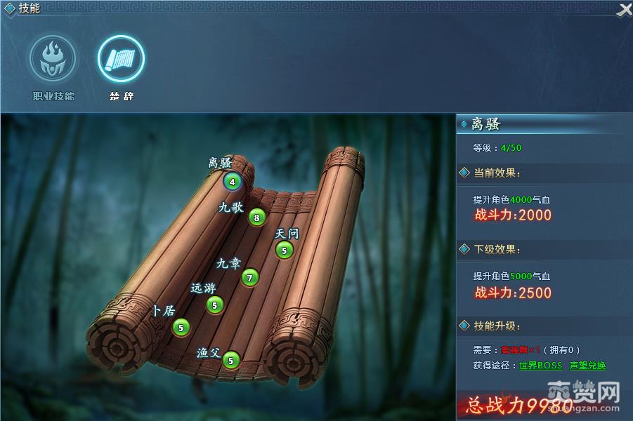 思美人楚辞系统由“离骚”、“九歌”、“天问”、“九章”、“远游”、“卜居”和“渔父”这楚辞七谏所组成,每种要素都对应一项属性的加成。具体如下: