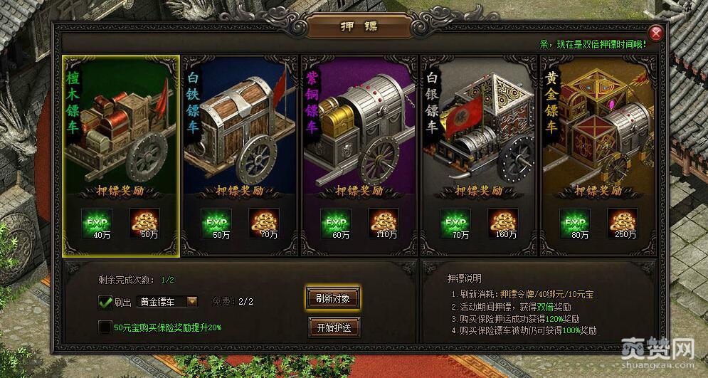 双倍押镖每天可以有两次机会,每次机会均要在半小时之内完成,所以玩家们一定要抓紧时间押镖哦!如果觉得运镖有风险,还可以选择花50元宝买一个保险,如果成功运送就会得到120%奖励,如果失败也会有100%奖励。