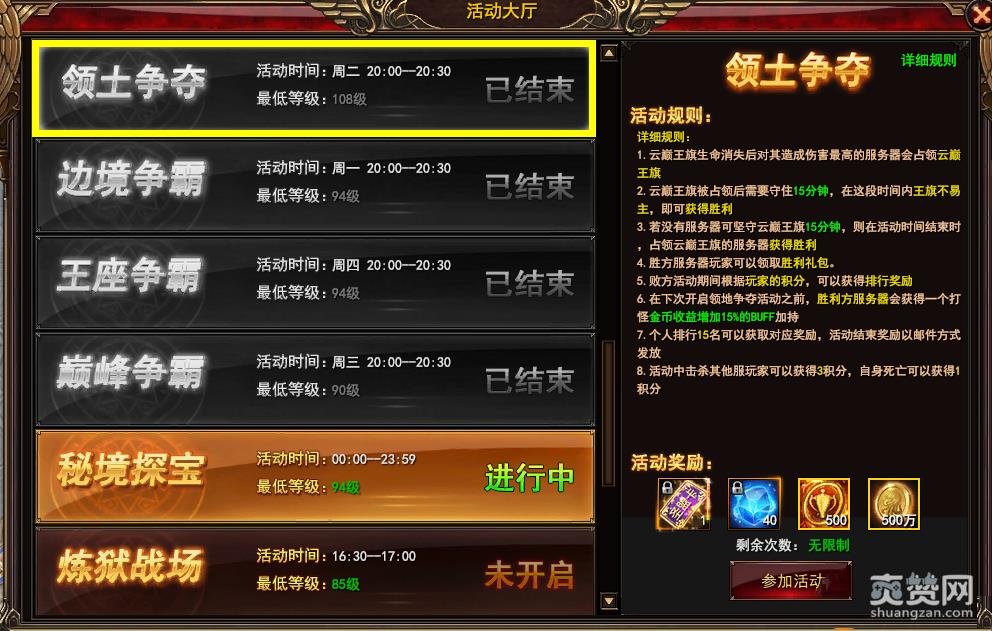 神印王座领土争夺活动副本在每周二的20:00至20:30开启,等级限制在108级以上。