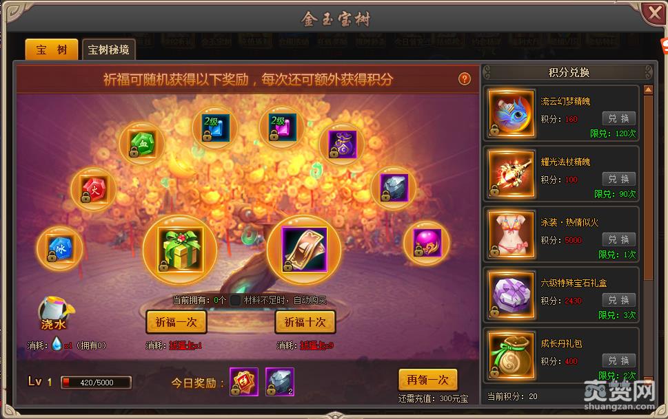 少年群侠传金玉宝树除了祈福抽奖以外,还可以对宝树进行浇水,提高宝树的经验值。当宝树的经验值达到一定阶段以后,玩家就可以升级宝树,获取更丰厚的奖励。玩家每天都可以领取一次宝树奖励,如果玩家当天充值数量达到一定的阶段,还会获得额外的奖励领取次数。