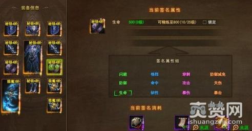 玩家们通过主界面下方的“装备”按钮即可点击进入装备系统,点击装备签名就可以进行装备签名,装备签名比较坑爹,装备签名消耗签名石,分绿色属性,蓝色属性,紫色属性,橙色属性。橙色属性是最不好刷出来的,如果刷出来的橙色属性,必须用锁定符锁好,否则的话玩家刷出来的好属性就会被替换。好在装备签定不会随着装备的升级升阶改变。