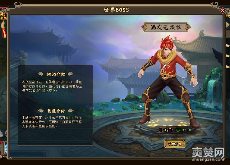 在游戏中,当玩家等级到达50级,可挑战世界BOSS。每天14:00-14:30、19:30-20:00开启获得。活动开启时,会在主界面右上的功能按钮下面,显示世界BOSS图标及开启时间,玩家可通过点击世界BOSS图标、活动大厅进入。